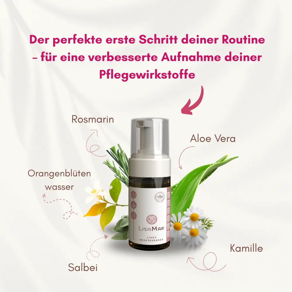 | Inhaltsstoffe Reinigungsschaum | Aqua, Rosmarinus officinalis flower/leaf/stem water*, Aloe barbadensis leaf juice*, Glycerin, Citrus aurantium amara flower water*, Lavandula angustifolia oil*, Salvia officinalis leaf extract, Chamomilla recutita flower extract, Olea europaea leaf extract, Rosmarinus officinalis leaf extract, Sodium hyaluronate, Sodium coco-sulfate, Lauryl glucoside, Benzyl alcohol, Cocamidopropyl betaine, Sodium cocoyl glutamate, Potassium sorbate, Alcohol, Caprylyl/capryl glucoside, Sodium benzoate, Parfum (natural fragance raw material), Lactic acid, Linalool**. (*) Bio zertifizierte Inhaltsstoffe (**) Inhaltsstoffe aus natürlichen ätherischen Ölen |