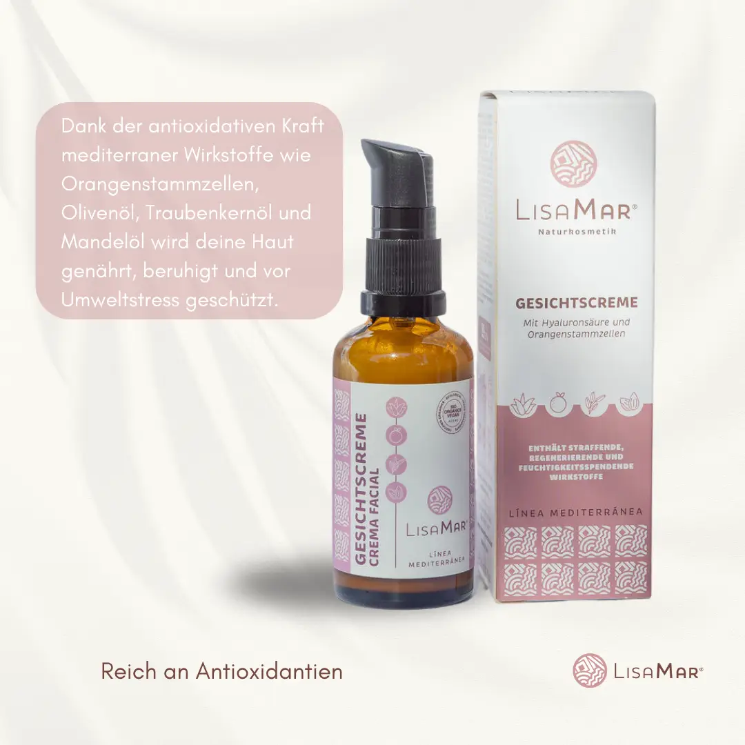 Trage anschließend die Gesichtscreme auf und genieße den natürlichen Duft. Hyaluronsäure, Orangenstammzellen und mediterrane Öle spenden intensive Feuchtigkeit, straffen und schenken deiner Haut neue Ausstrahlung.