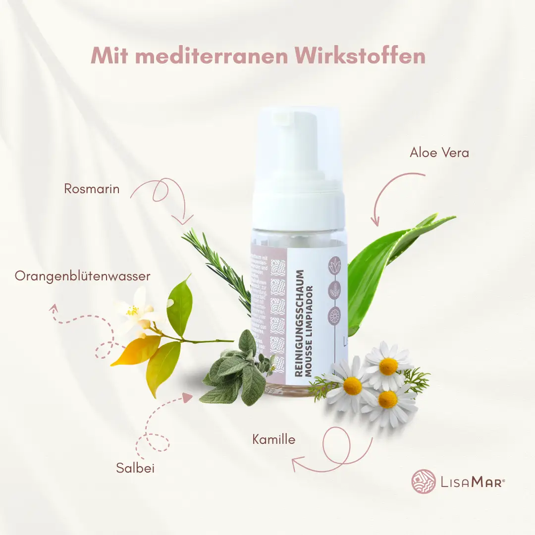 | Inhaltsstoffe Reinigungsschaum | Aqua, Rosmarinus officinalis flower/leaf/stem water*, Aloe barbadensis leaf juice*, Glycerin, Citrus aurantium amara flower water*, Lavandula angustifolia oil*, Salvia officinalis leaf extract, Chamomilla recutita flower extract, Olea europaea leaf extract, Rosmarinus officinalis leaf extract, Sodium hyaluronate, Sodium coco-sulfate, Lauryl glucoside, Benzyl alcohol, Cocamidopropyl betaine, Sodium cocoyl glutamate, Potassium sorbate, Alcohol, Caprylyl/capryl glucoside, Sodium benzoate, Parfum (natural fragance raw material), Lactic acid, Linalool**. (*) Bio zertifizierte Inhaltsstoffe (**) Inhaltsstoffe aus natürlichen ätherischen Ölen |