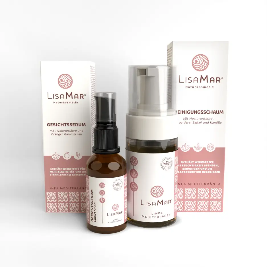 Start your skincare routine with the LisaMar® skincare set, which includes a gentle cleanser and a moisturizing hyaluronic acid serum. The cleansing foam thoroughly removes dirt, sebum, and makeup residue from your skin – without drying it out. Natural ingredients like rosemary, aloe vera, and sage have antibacterial and soothing properties. The creamy texture leaves your skin feeling soft and perfectly prepares it for the next steps in your skincare routine.