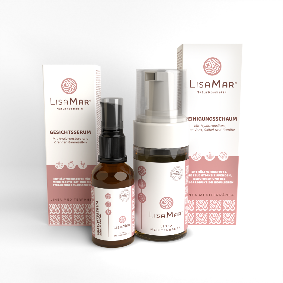 Reinigungsschaum: Reinigt die Haut sanft und porentief, entfernt Make-up und Unreinheiten, ohne auszutrocknen, und hinterlässt ein erfrischtes, klares Hautbild.; Gesichtserum: Spendet intensive Feuchtigkeit, polstert die Haut sichtbar auf und verleiht ihr einen frischen, natürlichen Glow dank Hyaluronsäure und mediterraner Pflanzenextrakte. |